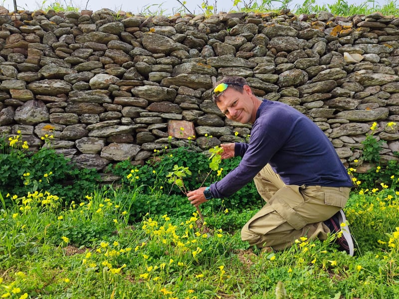 Ο Γιώργος επέλεξε το αμπέλι: έβαλε διάφορες ποικιλίες, τόσο για το τραπέζι όσο και για να φτιάξει κρασί, για να τιμήσει τους θεούς και φυσικά τους ανθρώπους.