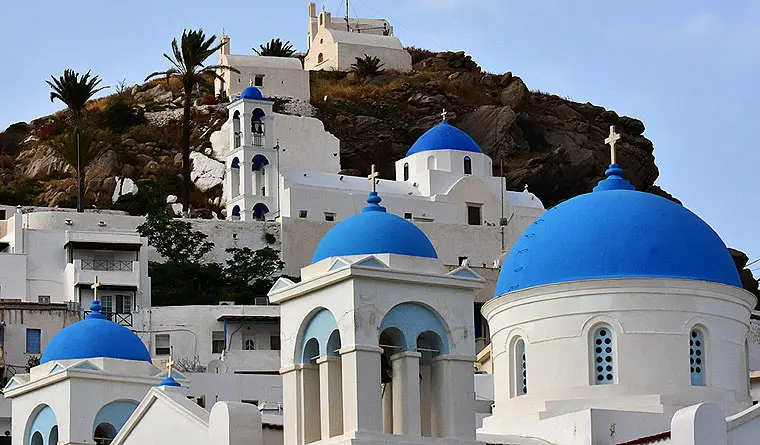 The church of Panagia tis Gremniotissa, is one of the most famous churches of Ios and dominates the town with the two characteristic palm trees in its courtyard.